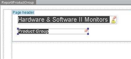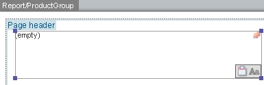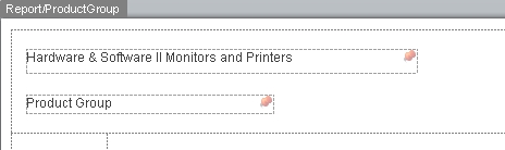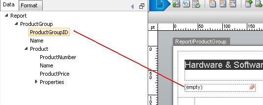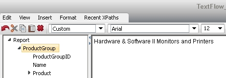 Now you need the XML tree on the left side, we mentioned it earlier. The text you entered so far is static text, this means it is not depending on any XML content, therefore it will not change. But we want to display the name of the product group there as well, which will be dynamic text, changing according to the XML content. To achieve this, drag the node Report/ProductGroup/Name to the right of the static text (don't forget the blank space between them):