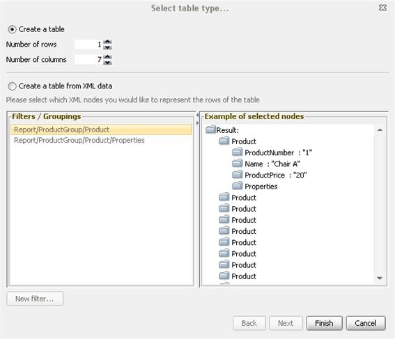 The XML file is always read from the top by the application, (from the node you linked the page to because the page is the base of your layout). The node "ProductGroup" contains the node "Product", as you see. As you have already linked the page to the node "ProductGroup", now you link the table to the node "Product" because this node contains the information we want to see in the table. This way you determine that the table will contain contents from the node "Product" and from its subordinate nodes. Now select the node "Product" and click "OK".