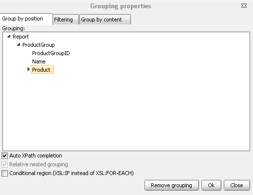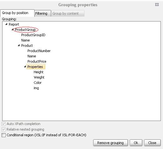 First, the groupings have to be specified. XSLfast automatically retrieves the data from XML. The example requires the grouping of the page to the first node below Report. The node′s name is ProductGroup.
