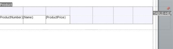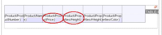 Next you need to place more dynamic text frames into the table cells. We need the following nodes from the node Product: ProductNumber, Name, ProductPrice. Drag and drop these nodes into the first three table cells. (Please do not confuse the table cells with the header cells.)