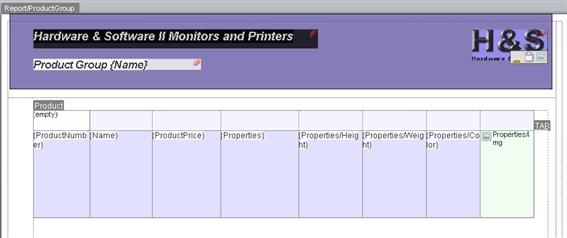 And now you need to make a connection. You need to group the image frame to the correct node of the XML file, which means you connect the frame to the node containing the image information. The complete path from the top of the XML file to that node is Report/ProductGroup/ Product/Properties/img. But this frame is part of the table (that you already grouped to the node Product) which means the first part of the path to the correct node is already determined: Report/ProductGroup/Product/ and only the missing part Properties/img must be considered. Double click the image frame and drag the correct node from the XML tree on the left to the right editor window as you did with the text frames. After that, make the cell a little bigger by dragging the lower rim down: